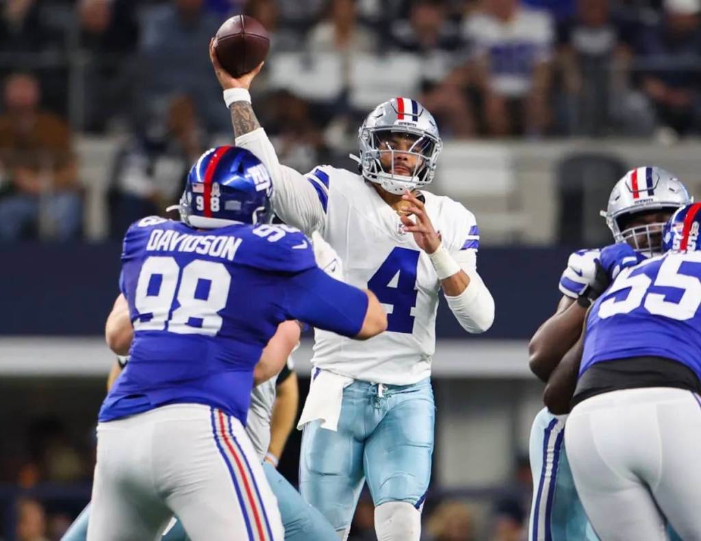 Dallas quarterback Dak Prescott completed 26 of 35 passes for 404 yards, four touchdowns and an interception. Backup Cooper Rush played the fourth quarter. The Cowboys compiled 640 yards of offense to 172 for the Giants.