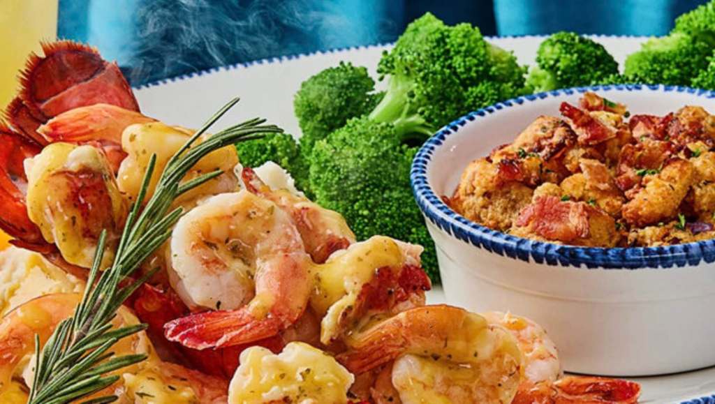 - New Lobster & Cheddar Bay-Stuffed Shrimp: A roasted Maine lobster tail paired with shrimp topped with a savory brioche, Cheddar Bay, bacon, and mushroom stuffing, all served with choice of two sides.