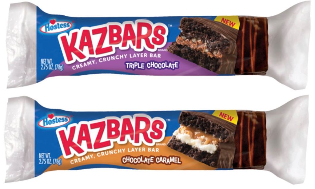 Available in two varieties – Chocolate Caramel and Triple Chocolate – Kazbars feature layers of soft chocolate cake, creme, candy crunch and a caramel or smooth chocolate fudge filling. Each bar is covered in a rich chocolate-flavored coating and topped with a sweet drizzle.