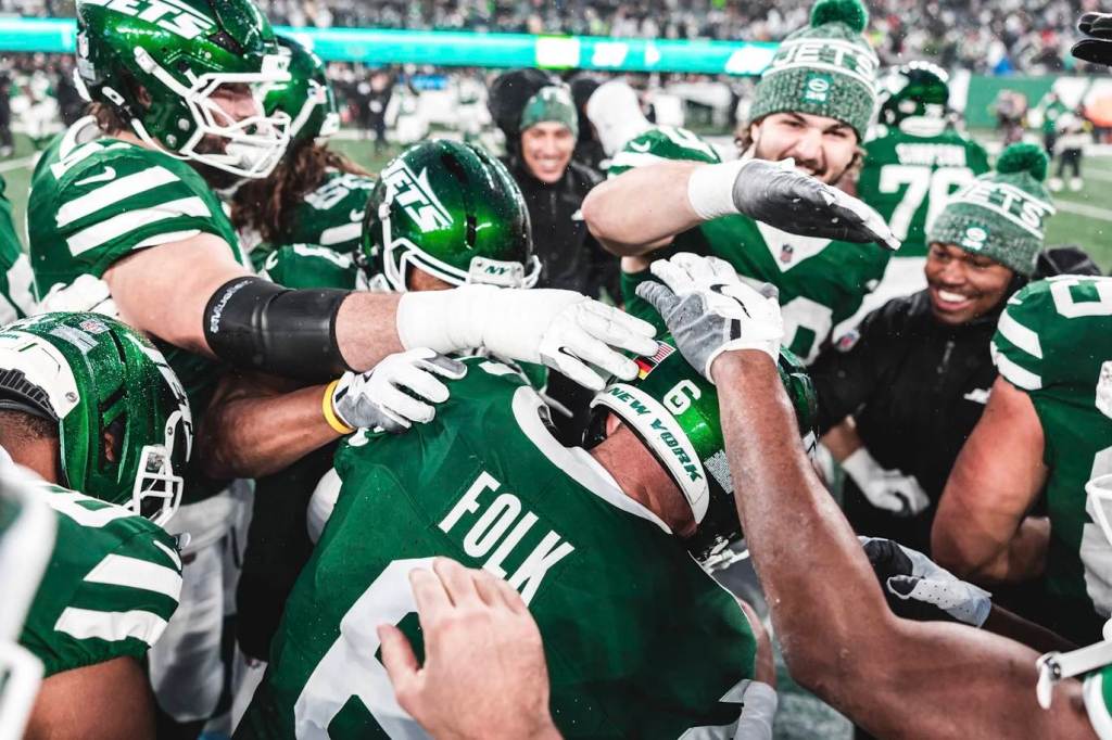 In a game between two struggling teams that was anything but pretty, Folk’s kick was also far from it. But in tough conditions, the 41-year-old got just enough on the football and was mobbed at midfield by his teammates as the Jets fans in a drenched and half-empty MetLife Stadium went wild.