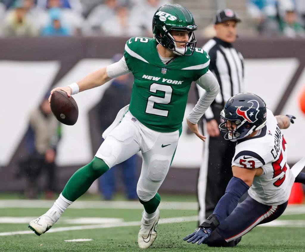 Quarterback Zach Wilson was under siege in the first half behind an offensive line that played an atrocious game. He exited the game just before halftime with a head injury. Wilson had no chance to duplicate his performance against the Texans last week as he was under pressure every time he dropped back and was sacked four times. Wilson was 4-for-11 passing for 26 yards and had a fumble.